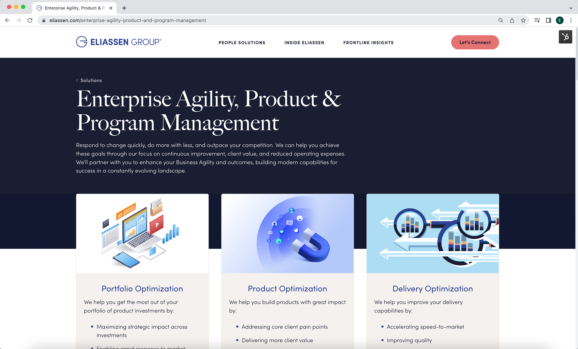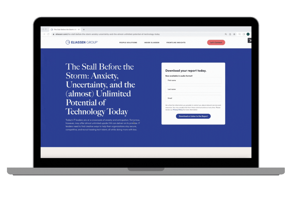 This section highlights my work on the Eliassen Group website. I designed, built, and maintained key pages to ensure a good user experience and engaging visuals. My redesign of the entire technology solutions portion of the site resulted in a significant 15% increase in web traffic. The examples below showcase a couple of my web content creations within their brand.