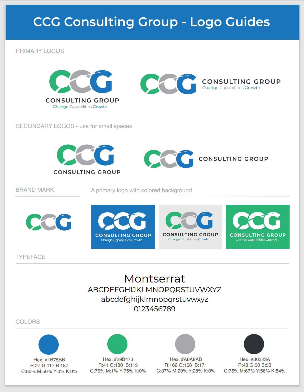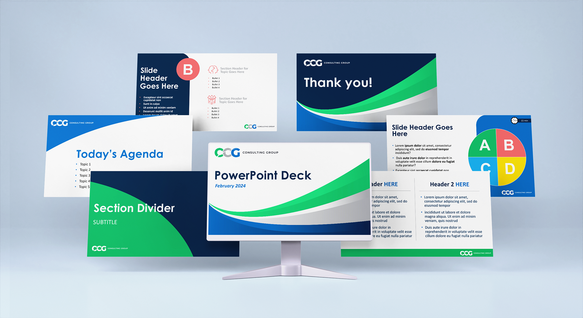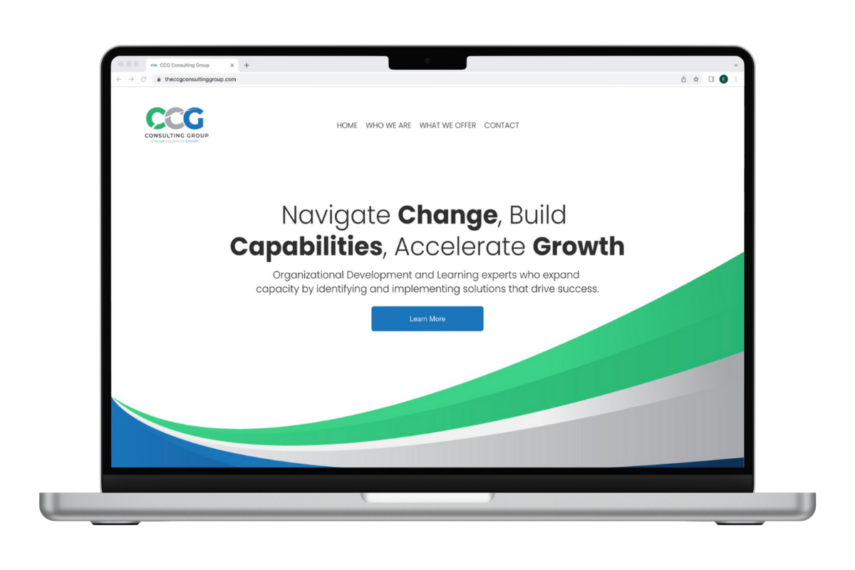 A logo revamp maintaining upward symbolism and colors, a modern website, and a PowerPoint template were created for CCG Consulting Group, utilizing swishy, upward-moving graphics to convey growth and change, as requested without the use of stock photography.